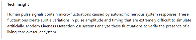 In practical terms, this means the barrier to entry for biometric spoofing has increased dramatically. While deepfake software can be downloaded by almost anyone, constructing a physiological signal simulator capable of passing Liveness Detection 2.0 checks would require advanced biomedical engineering capabilities.